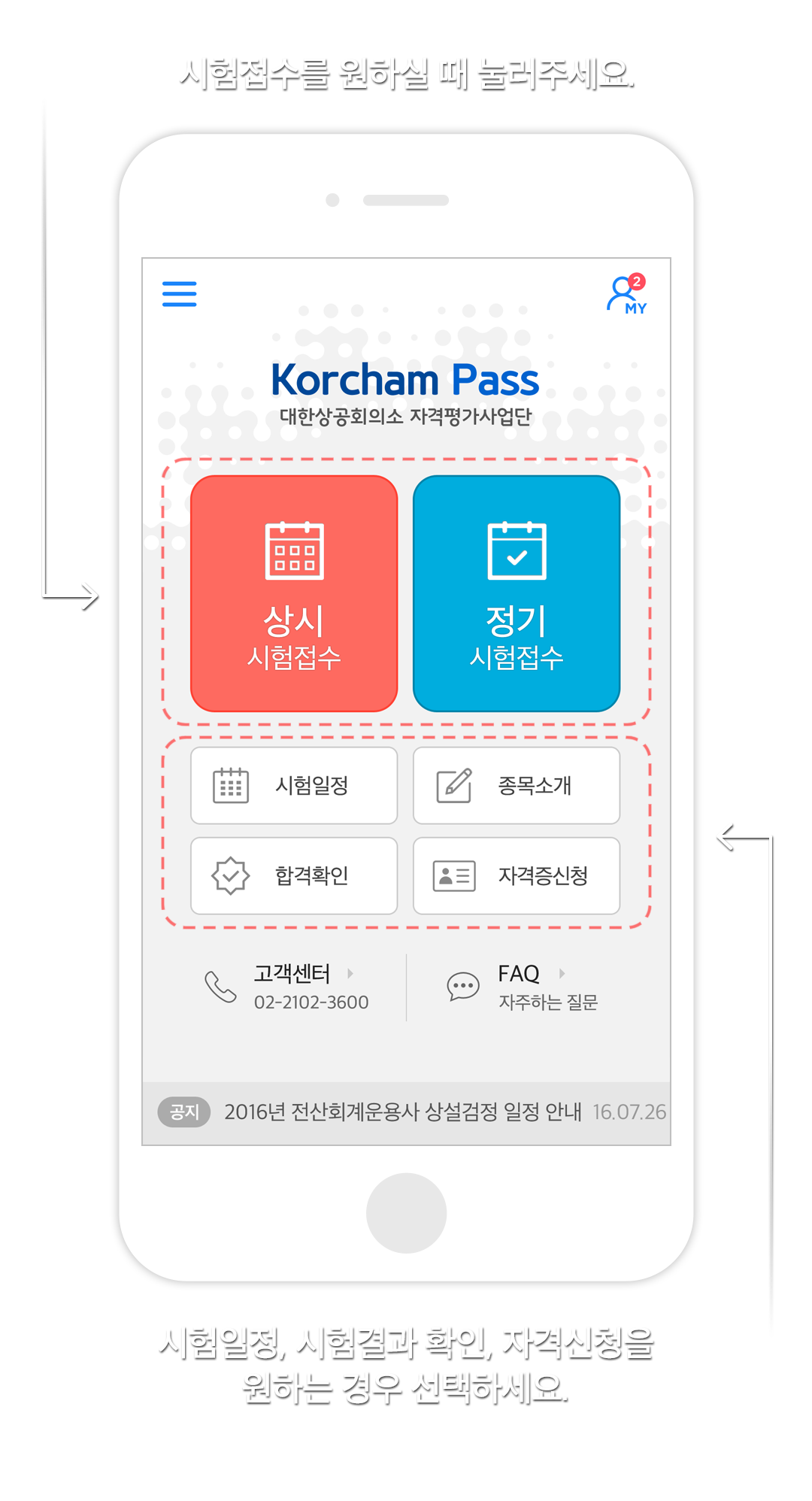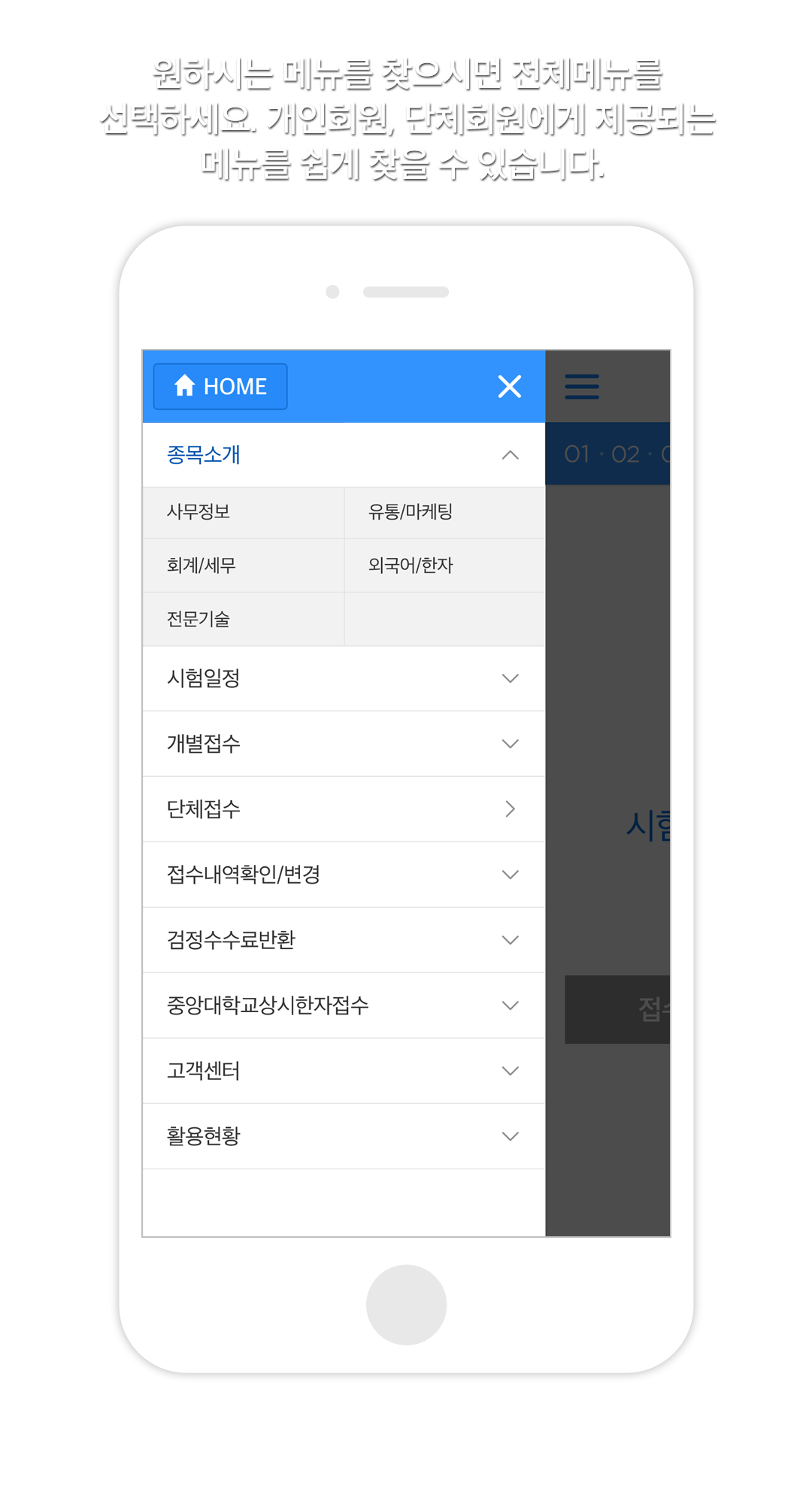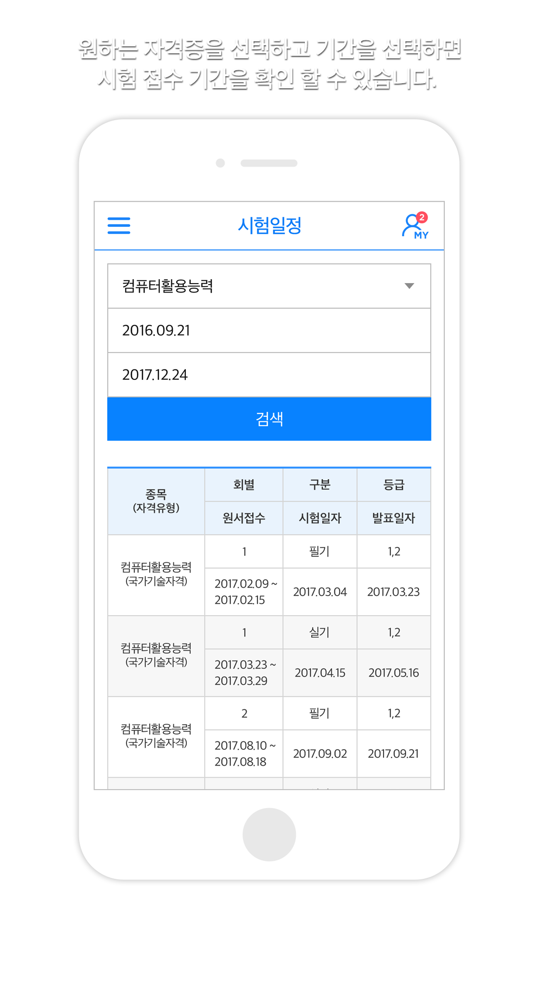 메뉴버튼: 시험일정, 시험결과 확인, 자격신청을원하는 경우 선택하세요.