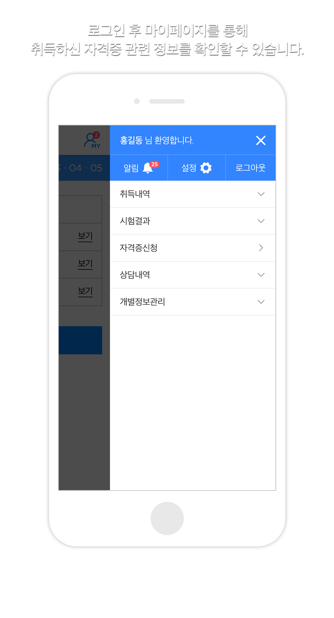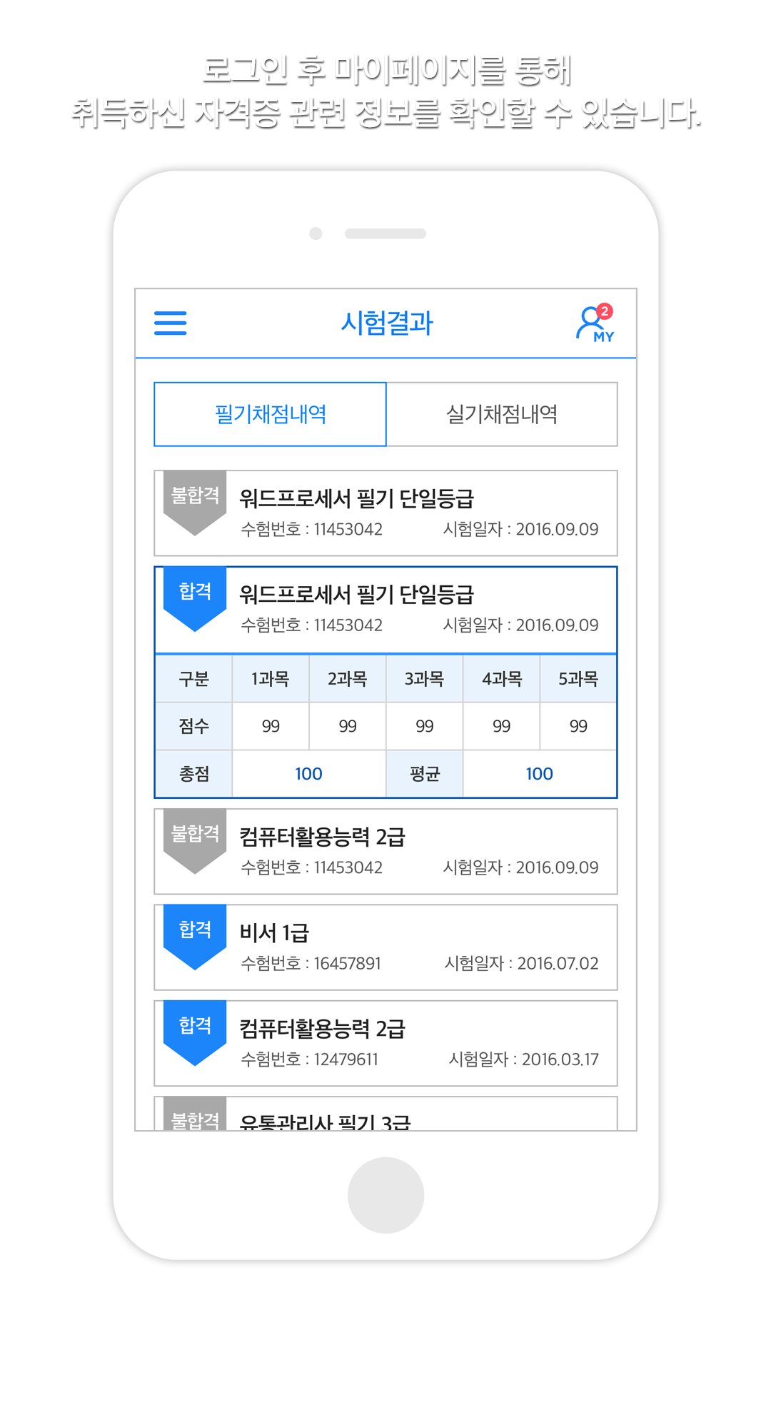 로그인 후 마이페이지를 통해 취득하신 자격증 관련 정보를 확인할 수 있습니다.