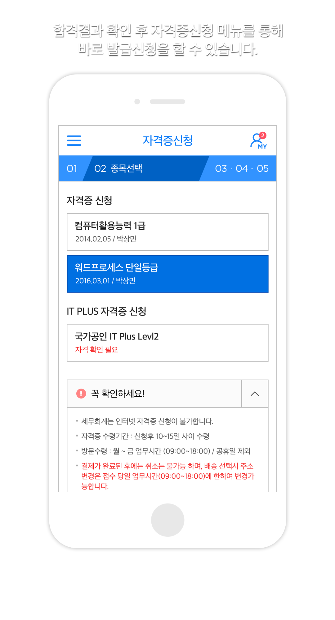 합격결과 확인 후 자격증신청 메뉴를 통해 바로 발급신청을 할 수 있습니다.